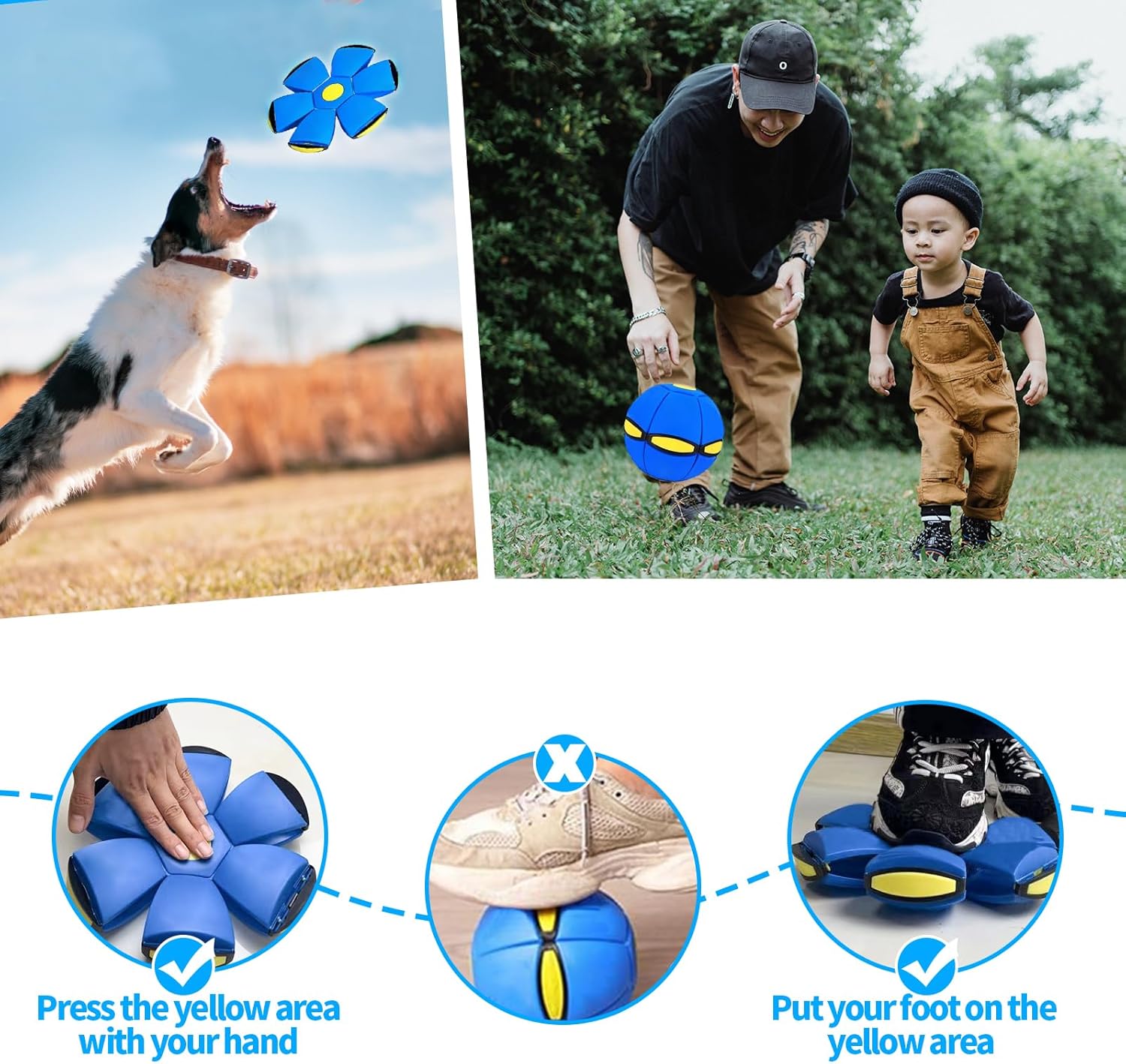 A 2-in-1 light-up toy that presses into a flying saucer and springs back into a ballâmade for giggles, movement, and parent-child play. Pets can join the chase, too. (Not a chew toy.)