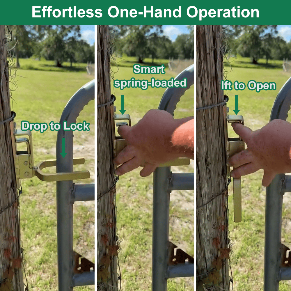 Open and close your gate in seconds with a simple lift-and-drop motion. The smart spring-loaded design allows for quick one-handed use — perfect when you’re holding tools, carrying feed, or managing livestock.