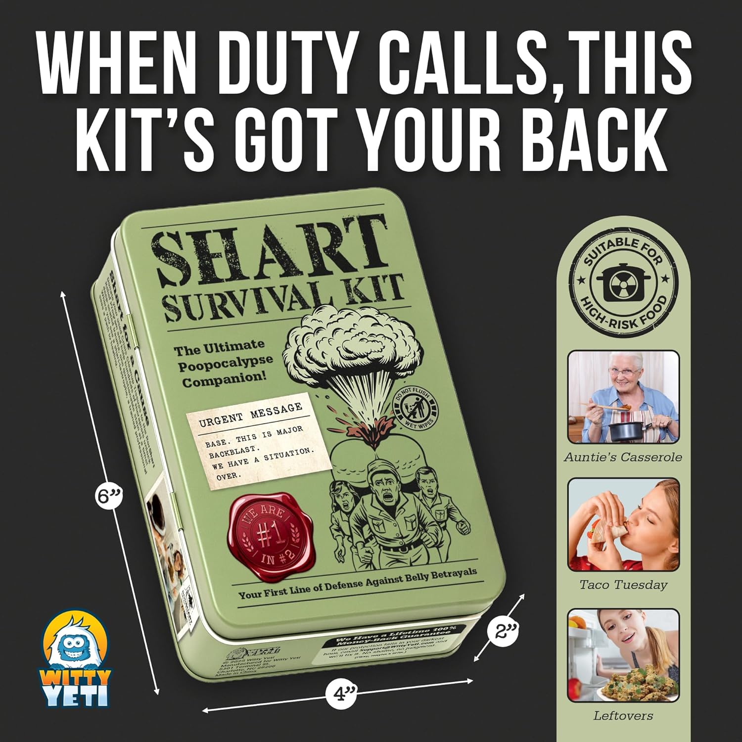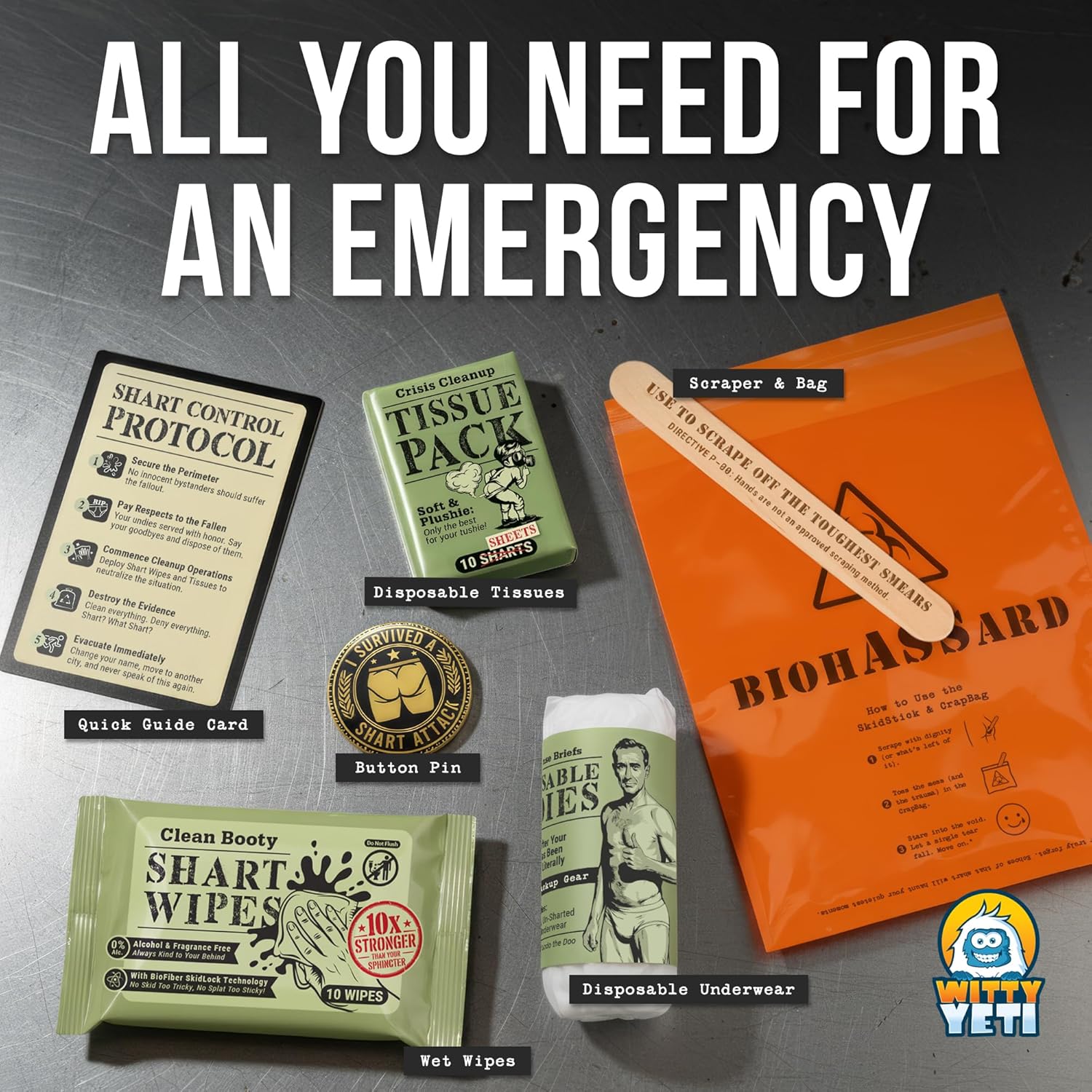 You'll receive a hinged metal tin shart kit containing a tissue pack, non-alcoholic wet wipes, white disposable underwear, survivor's badge and an instructions card. Wipes NOT FLUSHABLE.