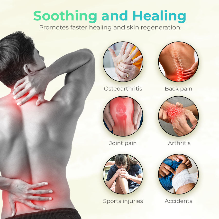 Improves mobility, reduces swelling, decreases pain. Soothes irritated skin, sore muscles.